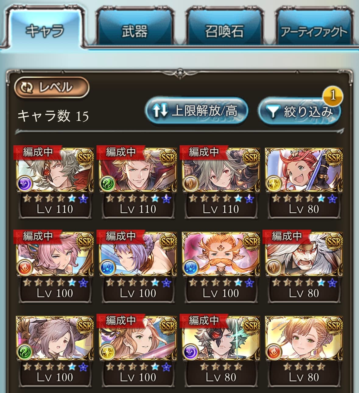 やっと全員上限解放できた!ヤッターーー 1回の古戦場でボックスガチャ4箱開けて飽きたりとか(40箱でだいたい一人分の素材)、普通にログイン忘れてたとかで えーーらい時間かかってしまった
